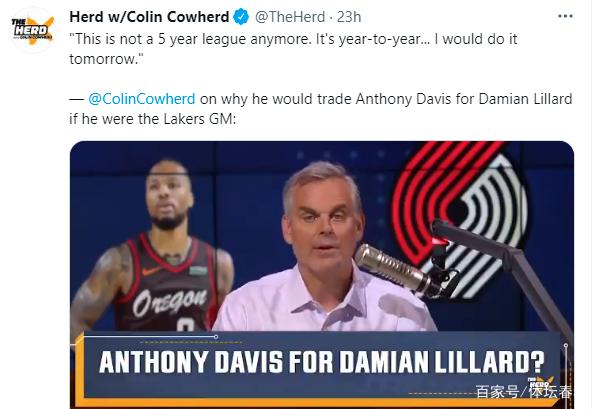 对于这笔交易,NBA分析师科林-考赫德认为,为了得到利拉德,湖人应该毫不犹豫地将戴维斯交易到开拓者,并表示这对他来说是一个根本不需要考虑的问题。因为,利拉德是另一个可以长时间打球的球员,而且湖人可以更多地依靠他来完成球队的进攻,而浓眉哥则完全无法做到这一点。