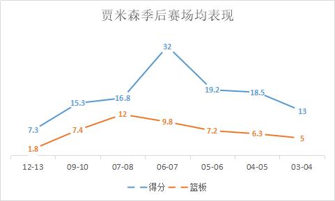 05-06赛季,贾米森取代休斯成为二当家,交出场均20.5分9.3篮板1.9助攻1.1抢断的表现,其中三分球命中率达到了39.4%,贾米森的三分球也提高到了一个比较准的水平,贾米森又进化了。
