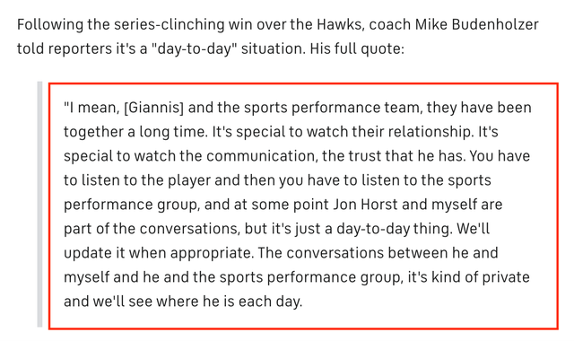 雄鹿即将在总决系列赛迎来对阵太阳的比赛,而字母哥的伤病问题毫无疑问是决定着雄鹿能否夺下总冠军的关键所在。而主教练迈克-布登霍尔泽也向记者透露字母哥的伤病情况: