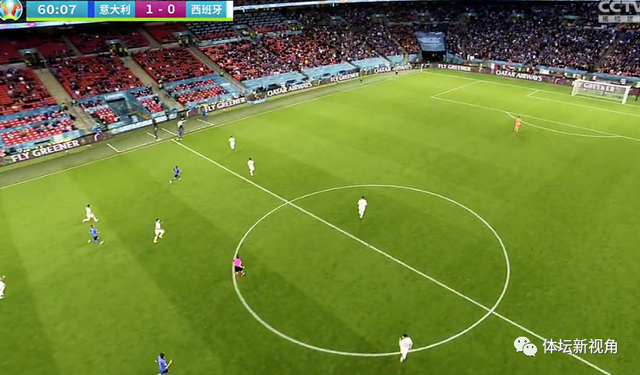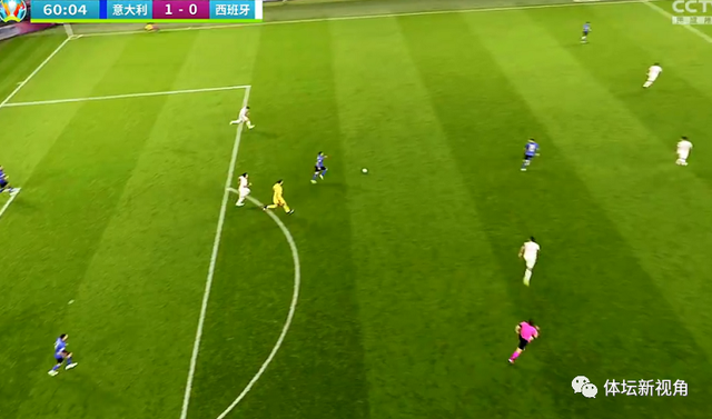 这是发生在下半场第60分钟,此时的场上比分仍然是0-0,西班牙的进攻被意大利门将多纳鲁马化解,随后多纳鲁马直接发动进攻,将皮球快速交到左后卫脚下,随后队友将球直接一脚快速传递到半场。
