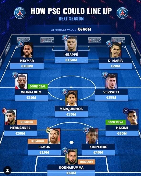 直播吧7月7日讯 阿什拉夫已经官宣加盟巴黎,《转会市场》也顺势预测了巴黎下赛季首发情况,总身价高达6.6亿欧。