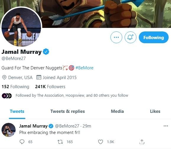 就在本场比赛结束之后,掘金队的50分巨星手握1.7亿大合同的贾马尔穆雷,发了一条推特写道:“拥抱当下吧,菲尼克斯人。”后面有网友直接留言说:“如果你在今年夏天加入到湖人队,你也可以拥抱这个时刻!”而穆雷立刻进行了点赞。