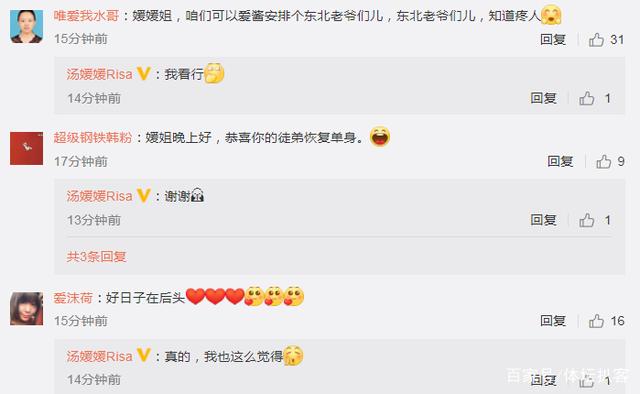 有网友表示,“媛媛姐,咱们可以爱酱安排个东北老爷们儿,东北老爷们儿,知道疼人!”汤媛媛表示,“我看行!”网友表示,“好日子在后头。”汤媛媛回应,“真的,我也这么觉得!”