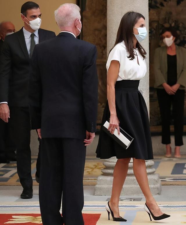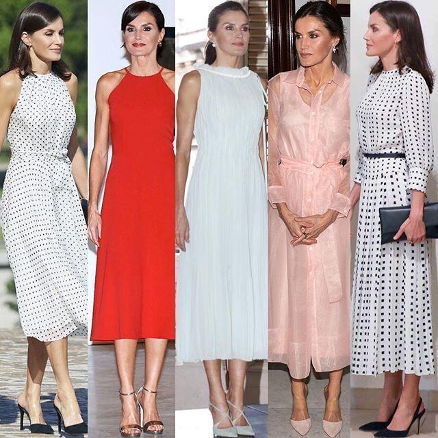 简约款的收腰连衣裙,很突出她衣架子一样的身材优势,她当然爱穿,而她身高不是很高,穿尖头高跟鞋可以视觉上延长腿线,进一步拉伸腿部线条,显得人整体更美,这就是来自西班牙王后的时尚小心机。