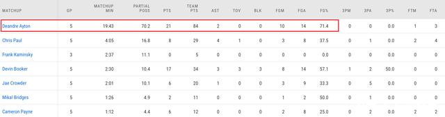 再来看看具体的单人防守情况。德拉蒙德理论上是湖人目前内线防守能力最好的球员,他今年季后赛他居然连一个第1次打季后赛的年轻人都限制不住。这位年轻人就是艾顿。