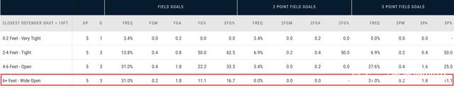 我们依然用用数据来说话。在很多人眼里湖人外线球员波普是球队头号射手,这两个赛季他的三分输出水准不差。可到了季后赛,波普的效率大打折扣,今年常规赛波普在6英尺以上的大空位投篮区域命中率超过40%,效率非常稳定。可到了季后赛,他的大空位投篮命中率下滑到11.1%。这占到他31%的总出手。每场比赛波普会在大空位投篮区域出手接近2次,命中个数只有0.2个,效率和产量不言自明。
