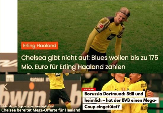 1.有英媒报道切尔西有意开出高达1.75亿欧的报价求购哈兰德,蓝军相信多特不会拒绝;而德媒则认为这种报价是不现实的,且多特也并无计划让哈兰德在今年离开。