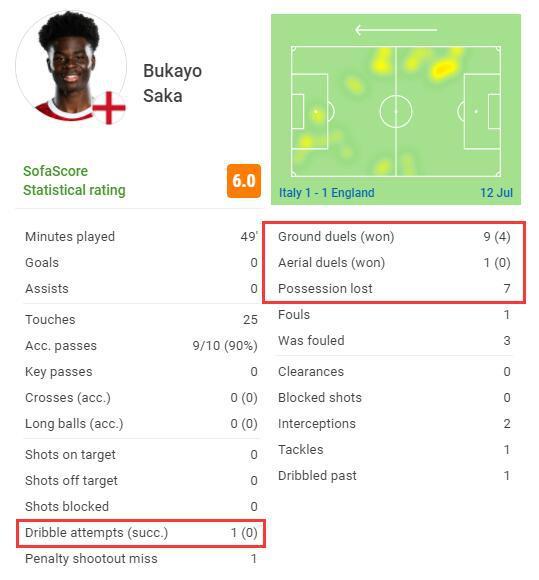 萨卡在50分钟的时间里,10次对抗成功3次,丢失球权7次,1次过人尝试(没有成功)。最大的效果,就是制造了基耶利尼的黄牌。同时,这个调整还因为特里皮尔的下场,让英格兰丢掉了右侧的有球传递。