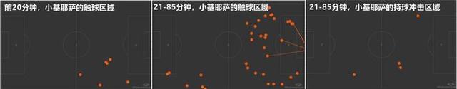 前20分钟,小基耶萨就是一个右边锋,即便是在狭窄的边路空间来到卢克-肖身后,他也很容易被马奎尔利用压迫逼到边路。但随后他的活动犯规变得很大,而且成为冲击英格兰俩后腰的一个关键点。于是,英格兰的防线开始变得混乱,而后场关键点马奎尔也很难照顾到斯通斯这个惧怕冲击的“弱”点,