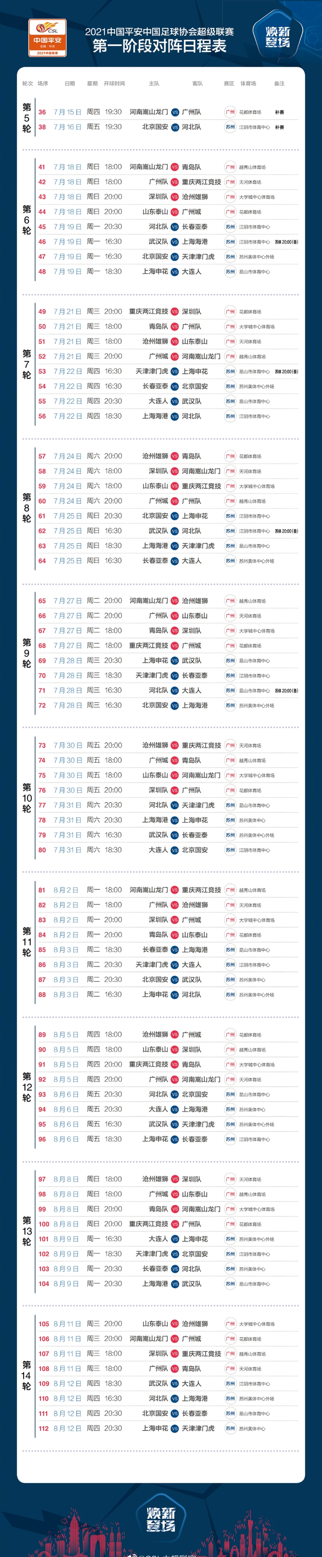 北京时间7月13日,中超联赛第一阶段第6轮至第14轮的比赛赛程已经获得了官宣确认,将在7月18日至8月12日完成,期间26天内连踢9场比赛,赛程相当密集,每个比赛日完成4场比赛。由于受到国足集训影响,广州队和北京国安2大豪门各自的第5轮比赛还未开打,此次恢复比赛,2大豪门的补赛先行。