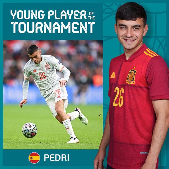 然而,更加的惊喜还在后头。年仅18岁的佩德里跳级入选国家队,并在欧洲杯赛场上大放异彩。他踢满了所有5场比赛,帮助西班牙打进四强,半决赛点球惜败意大利。