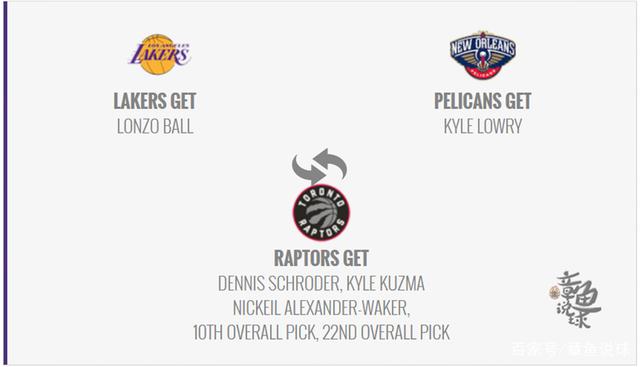方案3:三方大交易,湖人队得到球哥、鹈鹕队得到洛瑞,猛龙队则得到施罗德、库兹马、亚历山大-沃克、10顺位以及20顺位选秀权。