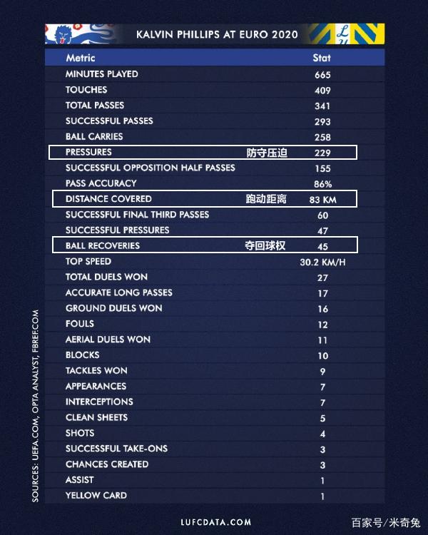 从菲利普斯本届欧洲杯的统计数据可以看到,他7场比赛一共跑了83公里、完成229次防守压迫,以及45次抢回球权。如果换算到90分钟,那就是每场跑11公里、30.5次防守压迫和6次抢回球权。