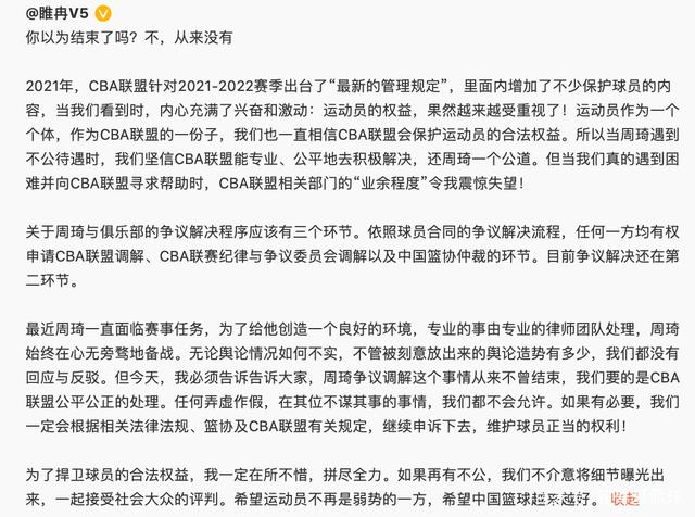 从整篇的动态不难看出,睢冉是就周琦申报CBA联盟有关于和新疆队合同纠纷的情况发表不满,睢冉认为CBA联盟处理此次情况不够专业,甚至有弄虚作假,不谋其事的作为。作为一名CBA经纪人,睢冉为了维护客户权益在所不惜,直接和CBA联盟开火,目前CBA官方还没有任何回复。