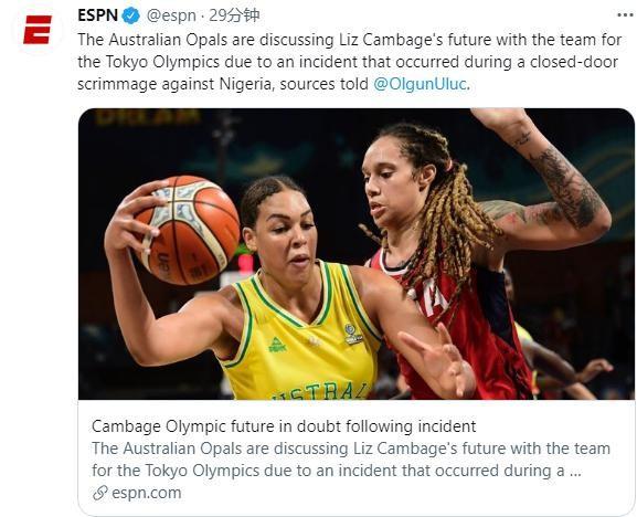 这一届奥运会,中国女篮的分组可以说是上上签,C组的三个对手分别是澳大利亚、比利时和波多黎各,根据规则,每个分组的前两名可以直接拿到八强入场券,除了澳大利亚以外,中国女篮整体实力在比利时和波多黎各之上。因此中国女篮和澳大利亚的较量将会是中国球迷最期待的一场比赛!巧合的是,FIBA近日刚刚发布了奥运会各队实力排名,中国女篮排名第四,第三名就是同组的澳大利亚女篮。不过近日中国女篮有一个非常大的利好消息,据ESPN报道 ,在近日澳大利亚女篮和尼日利亚女篮进行的一场热身赛中,澳大利亚女篮阵中的世界第一中锋坎贝奇卷入了冲突,还有指控说她使用了语言暴力,加上之前坎贝奇曾经违反过球队的规定外出,现在球队上下对其非常不满,这位超级中锋可能会被澳大利亚女篮踢出国家队。
