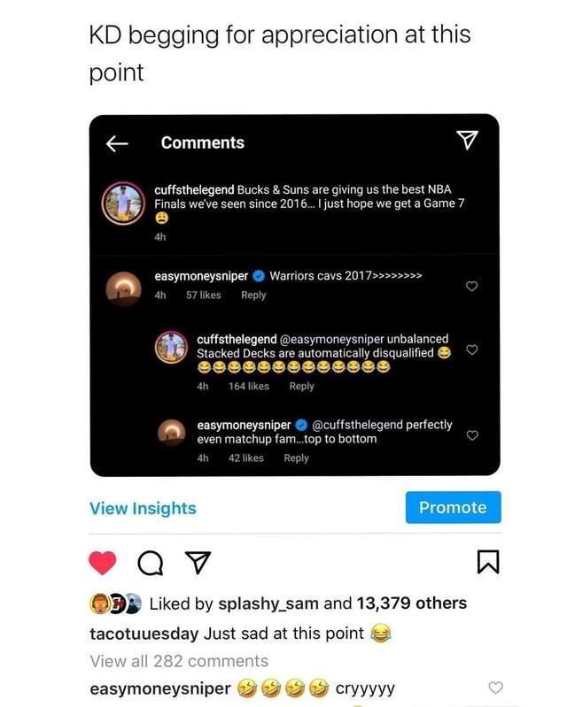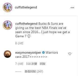 最近杜兰特在互联网上可是非常的忙,前有和网友在语音聊天室中争论,最近杜兰特又和网友在互联网上进行关于总决赛的互动。此前一位网友在互联网上说:今年的NBA总决赛是2016年之后最精彩的总决赛,希望能够打到7场比赛。而杜兰特则在这位网友下面评论道:2017年勇士VS骑士远大于今年。然后该网友回复到:实力悬殊的总决赛应该被自动排除。而杜兰特马上回复到:完全势均力敌的较量,老哥……从上到下都是如此。