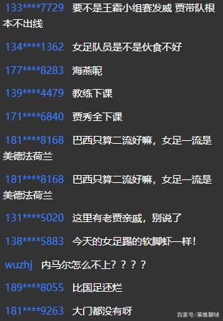 还有网友就怒不可遏的开口:“要不是王霜小组赛发挥,贾秀全带队根本出不了线。”、“贾秀全赶紧下课吧!”、“教练必须下课!”、“巴西这还是二流球队,女足的一流是美国,德国法国荷兰等球队,就这你都打不过。”、“女足踢得跟软脚虾一样,说句不好听的,她们比国足还差。”