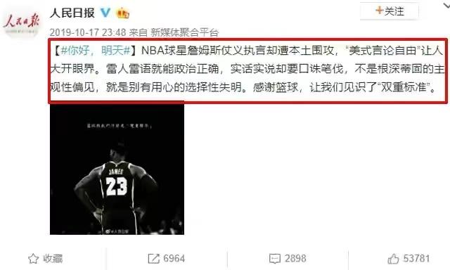 其次,詹姆斯不光在思想上维护人道主义,更用自己的行动来证明。昔日莫X的不当言论爆出后,詹姆斯则是发言表态,不太认同他的这番观点,此举得到了中国官方媒体的点赞。他宁可冒着被美国民众的唾骂也要伸张正义,这样正义的形象和优质的偶像,值得中国的青年们学习。