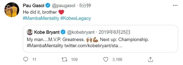 值得一提的是,科比生前的挚友大加索尔也是转发了当时科比的任务动态,并且评论道:“他做到了兄弟”#曼巴精神##科比的传奇#。对此很多网友都表示看到字母哥的采访和加索尔的这一句话直接泪目了,除了想念科比之外,更多的是感慨,科比对于每一个篮球人的影响都太深刻了,尤其是NBA很多球员和球星,大部分都将科比的曼巴精神视为精神动力。