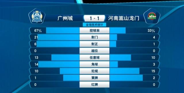 直播吧7月21日讯 中超第7轮,广州城1-1战平河南嵩山龙门,以前是全场的几项基础数据:
