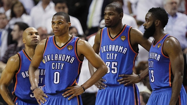 而正是这次的大爆发,让杜兰特彻底收获自信,一举蜕变为全联盟最炙手可热的顶尖巨星,11-12赛季,雷霆在杜兰特的带领下,竟然意外杀入总决赛的舞台,但奈何对手是如日中天,坐拥三巨头的热火,他们最终还是以1比4败下阵来。而这次的失利,也让球队的主要替补哈登离开,转投火箭,雷霆正式成为了以杜兰特+威少为双核的球队。而这期间,威少也迎来了大幅成长,跻身成为全明星级别的球星。但奈何球队虽仍然是季后赛的常客,却始终无法再度回到总决赛的舞台。15-16赛季,本该是雷霆最有希望杀回总决赛的一年,在3比1处于绝对领先的情况下,却遭勇士连扳3场,最终以3比4不敌对手,就此止步西部决赛。