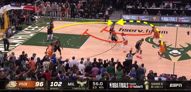 比赛最后56.9秒,太阳96:102落后雄鹿6分。此时,太阳主帅蒙蒂叫了暂停,进行战术布置,进行最后一搏。对于太阳来说,雄鹿防守重心肯定在布克和保罗身上。蒙蒂也针对这一特点进行了战术布置。