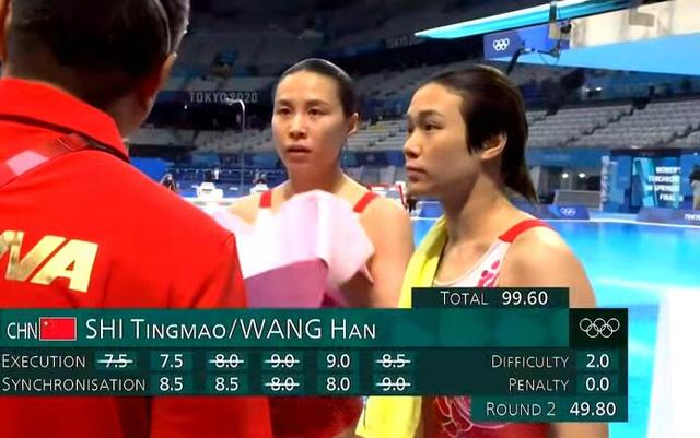 第二轮比赛,美国队这一跳拿到了50.4分的高分,总比分来到了99.6分,施廷懋和王涵这一轮选择了一个反身一周半转体,配合上出现一些小瑕疵,只拿到了49.8分,第二轮比赛结束,美国队比分追平我们,同为99.6分,并列第一。