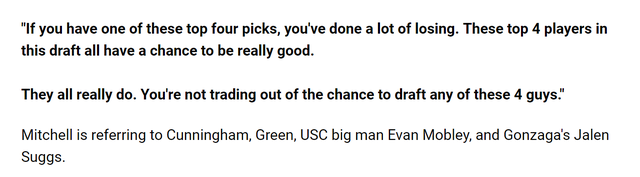 萨姆-米切尔指出2021年是公认的选秀大年,如果一支球队拥有前四顺位的首轮签,他们不应该再冒险。