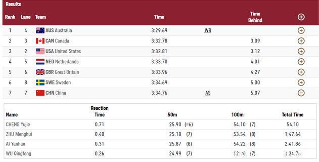 意外的是,决赛阵容没有发生变化,还是程玉洁、朱梦惠、艾衍含、吴卿风,四人拼尽全力,游出了比预赛更好的成绩,那就是3分34秒76,再次刷新亚洲纪录,但只获得第七名。从成绩来看,我们落后夺冠的澳大利亚比较多,但离第二名和第三名的差距并不大。很多泳迷认为,如果派张雨霏和杨浚瑄出场,有希望获得铜牌,泳迷对此展开激烈争论。