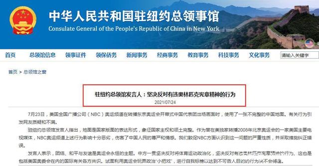 中国驻纽约总领馆发言人第一时间指出,地图是国家版图的表达形式,象征国家主权和领土完整。作为曾在美独家转播2008年北京奥运会的一家美国主要电视媒体,NBC奥运频道上述行为影响十分恶劣。