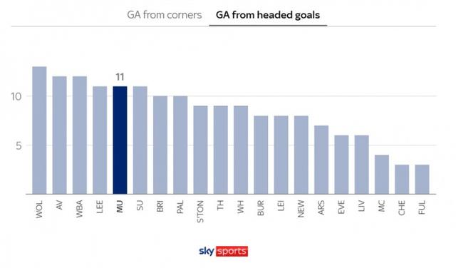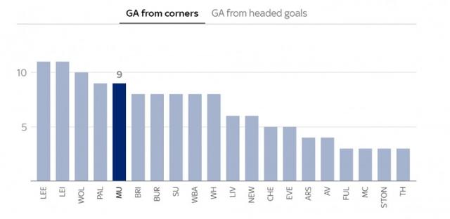 上赛季英超联赛中,曼联在角球和头球防守方面排名靠后