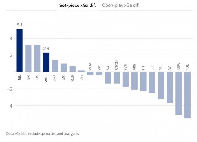 曼联实际定位球丢球数比预期多了5.1球,但运动战丢球比预期少了6.2个