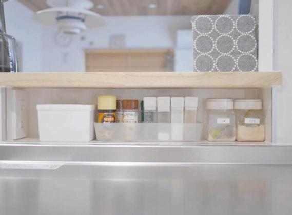 ②用来收纳,这增高的20cm,可是非常好用的,沿着台面下方做一个内凹的收纳区,就能放置需要调味罐、纸巾,在收纳量多一倍的同时,还不会占据操作空间,台面变得干净无物,料理起来更加顺手方便。