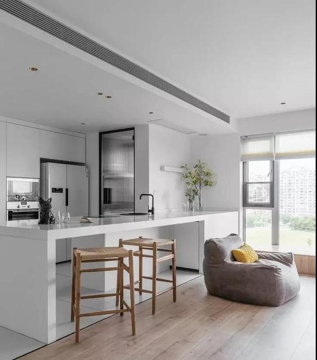 中岛台可以说是划分餐厅和厨房的最佳 选择了,既能保证空间的整体性,也能起到实质的划分作用。