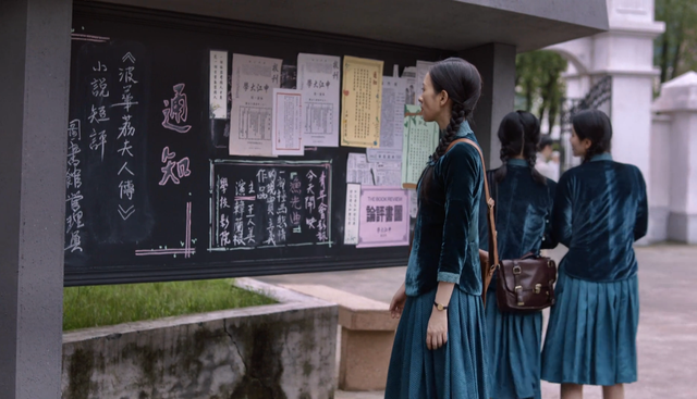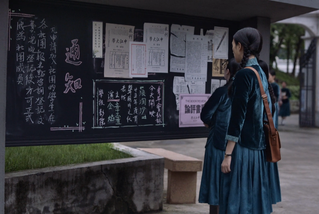 值得一提的是,在黑板报上不起眼的位置还有一个通知:青年会影讯,今日开映《渔光曲》。这部电影上映于1934年,在上海曾一度一票难求,出现在1936年的大学校园里非常应景。