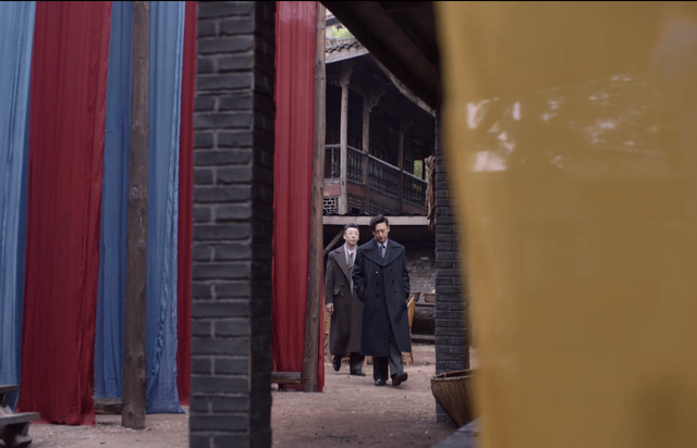 先是陈默群带着王世安走进布匹后面隐蔽处,此时的镜头里,靠近陈默群的是黄色的布,靠近王世安的则是红蓝色的布匹。